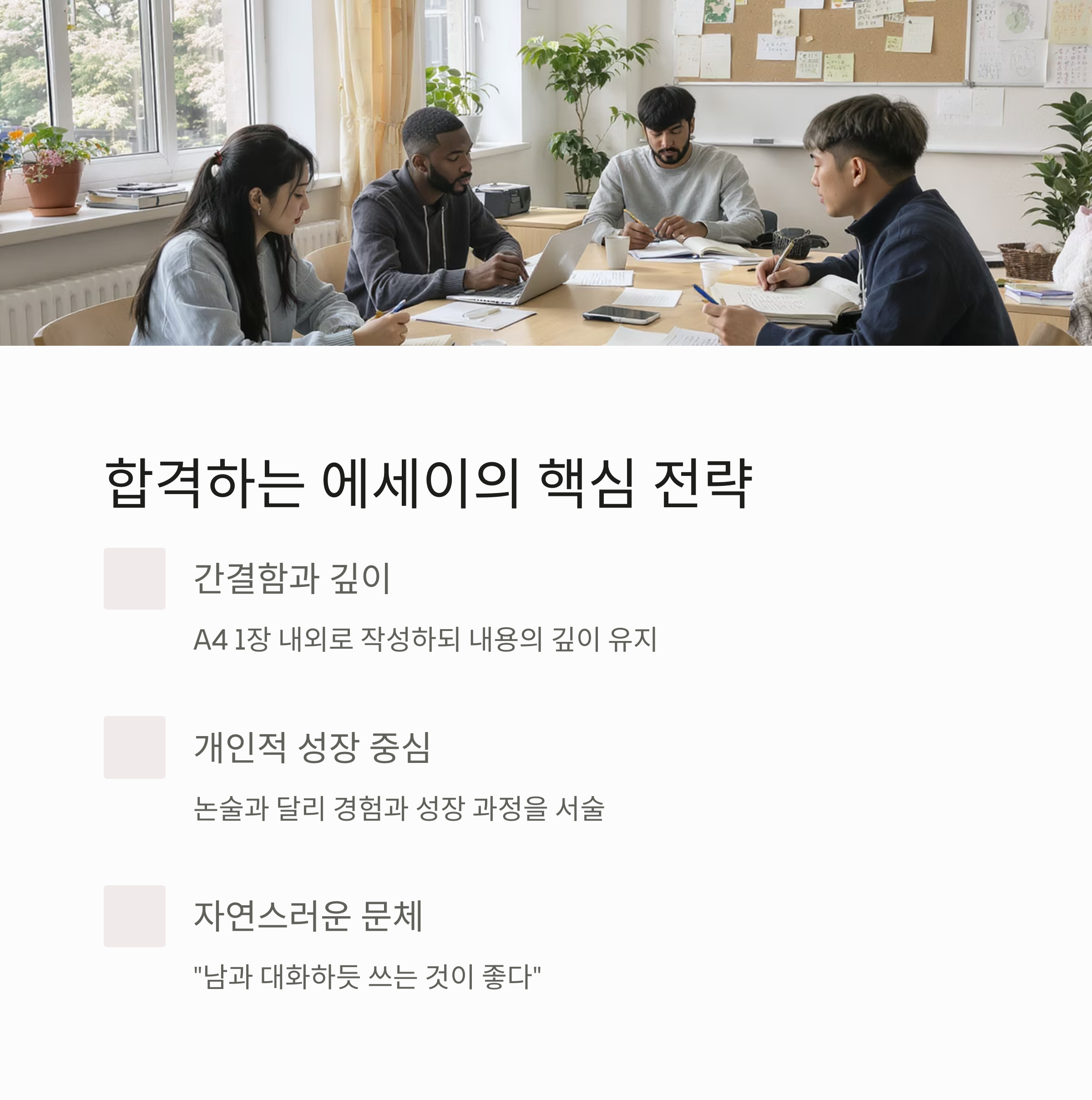 오늘의 글을 읽고 어떤 생각이 드셨나요? 댓글로 여러분만의 에세이 고민이나 질문을 자유롭게 남겨주세요. 함께 소통하며 더 나은 입시 전략을 만들어갈 수 있기를 바랍니다.