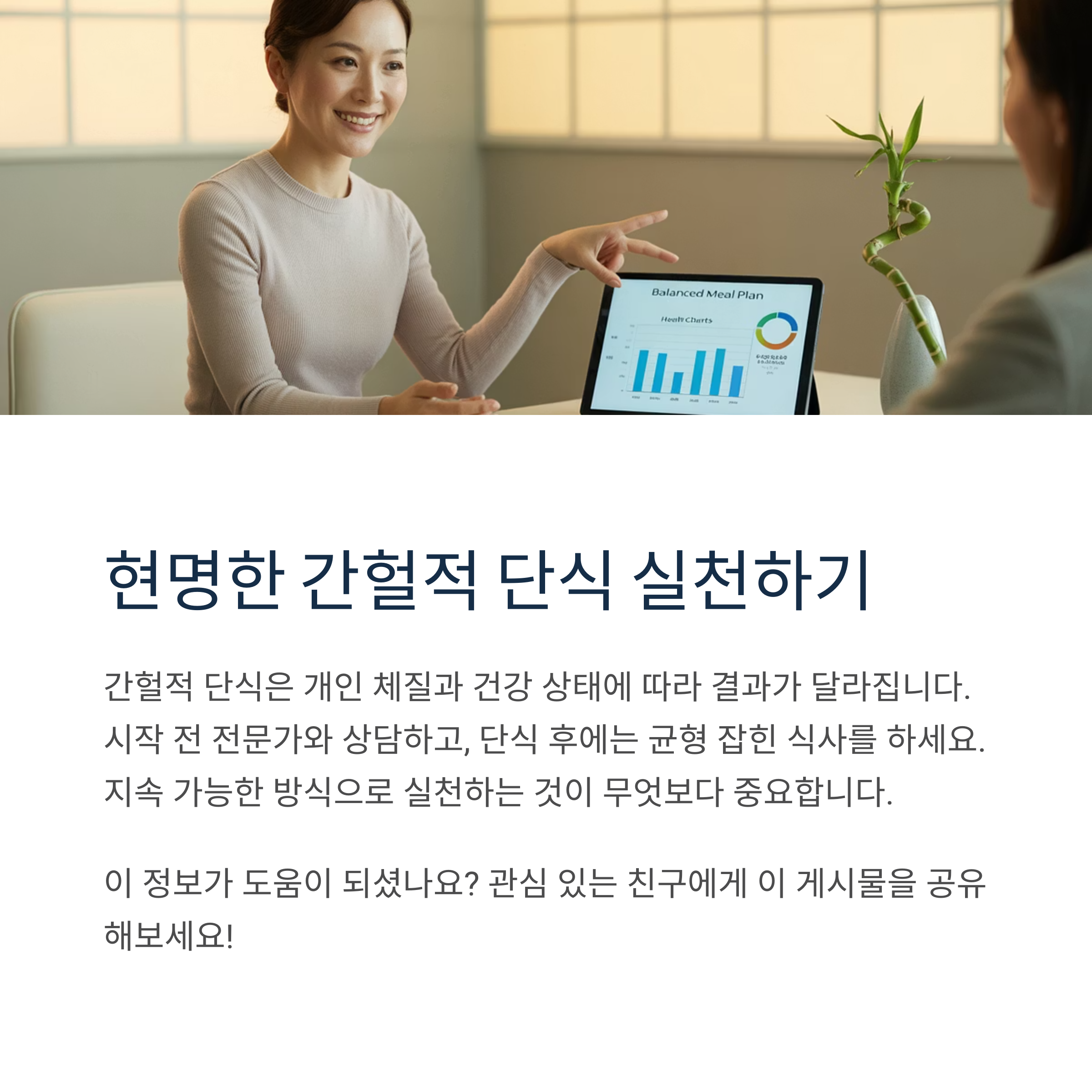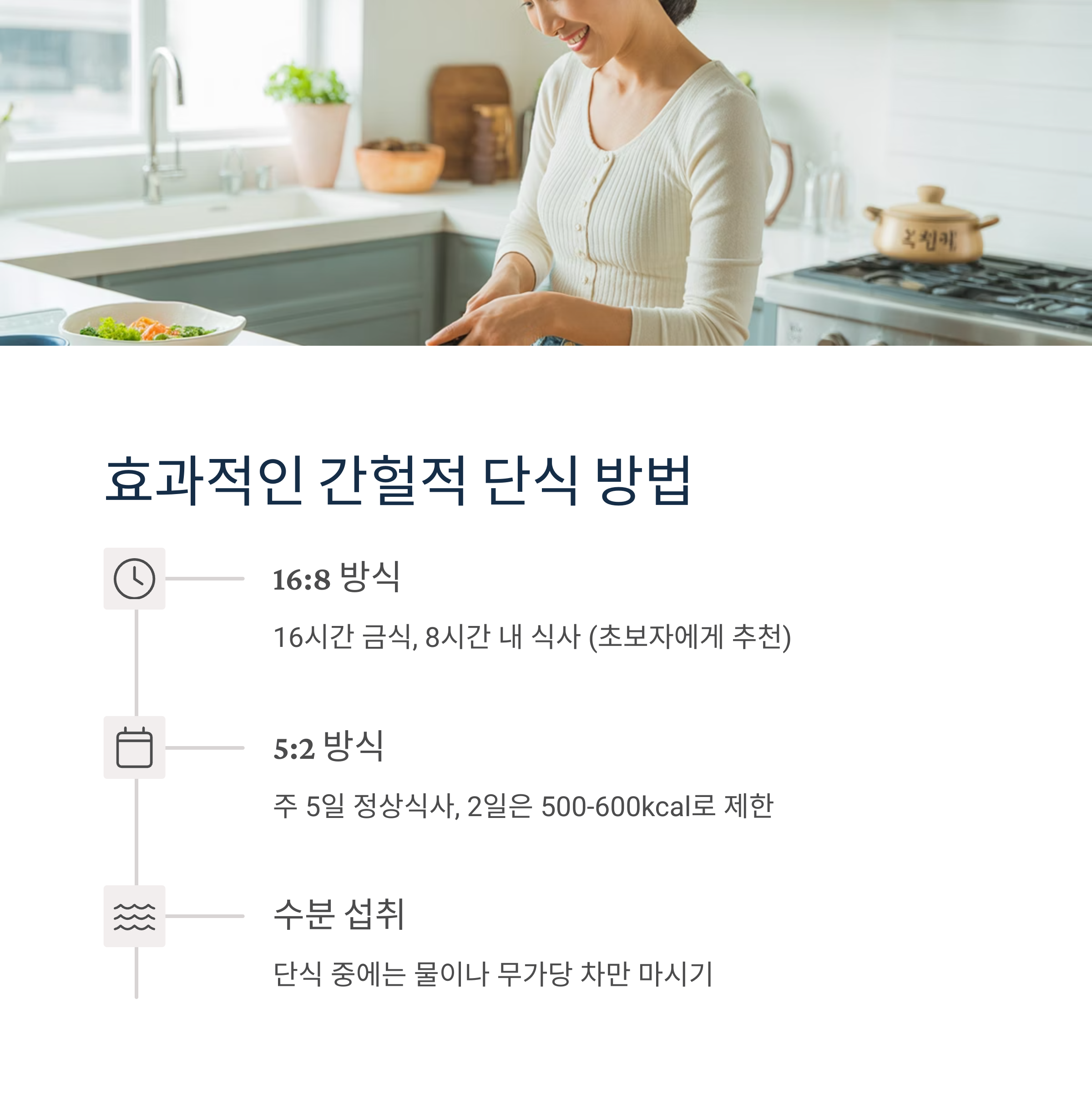 초기에는 16:8 방식처럼 완화된 형태로 시작해 점차 공복 시간을 늘려가는 것이 좋습니다. 전문가 상담을 병행하면 더욱 안전합니다.