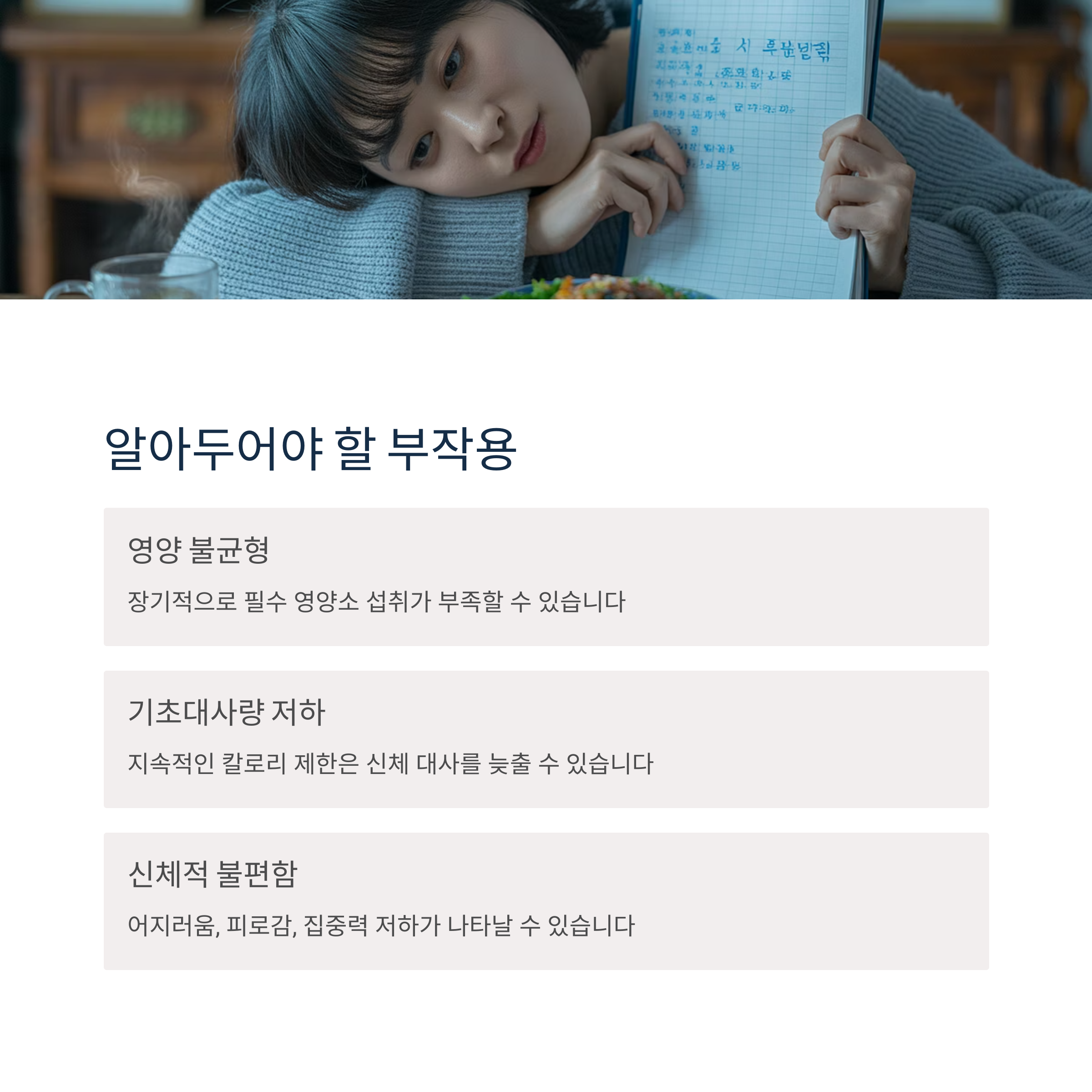 하루 한 끼 식사를 지속하면 우리 몸은 에너지 보존 모드로 전환됩니다. 이 과정에서 기초대사량이 점차 감소할 수 있으며, 식사 후 폭식을 유발하는 부작용이 생기기도 합니다. 또한 단백질과 각종 영양소 섭취가 충분하지 않다면 근육량 감소와 면역력 저하의 위험도 존재합니다. 특히 당뇨병이나 고혈압, 소화 장애가 있는 분들에게는 하루 한 끼 단식이 오히려 건강에 악영향을 줄 수 있어 의학적 조언이 반드시 필요합니다.