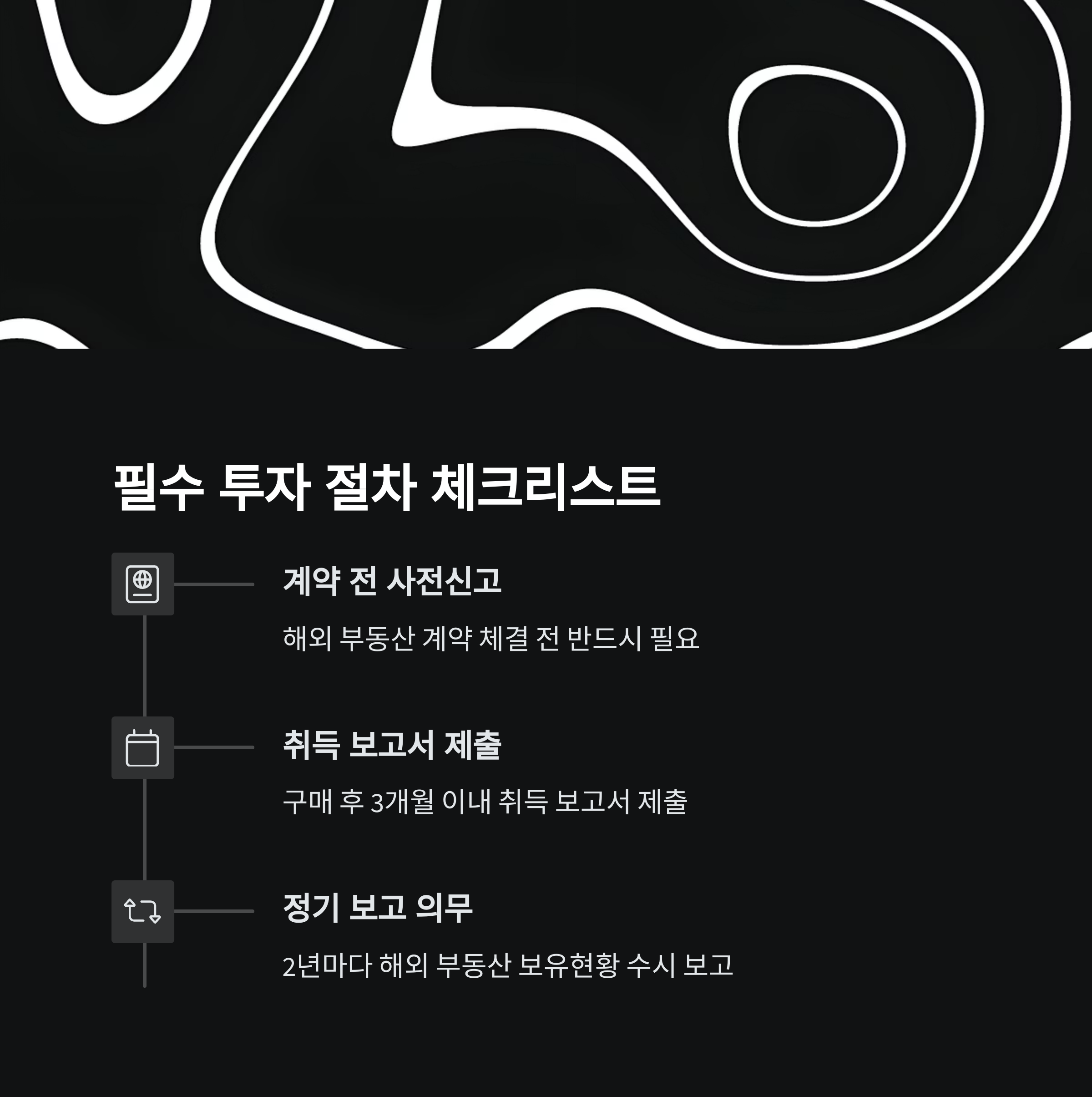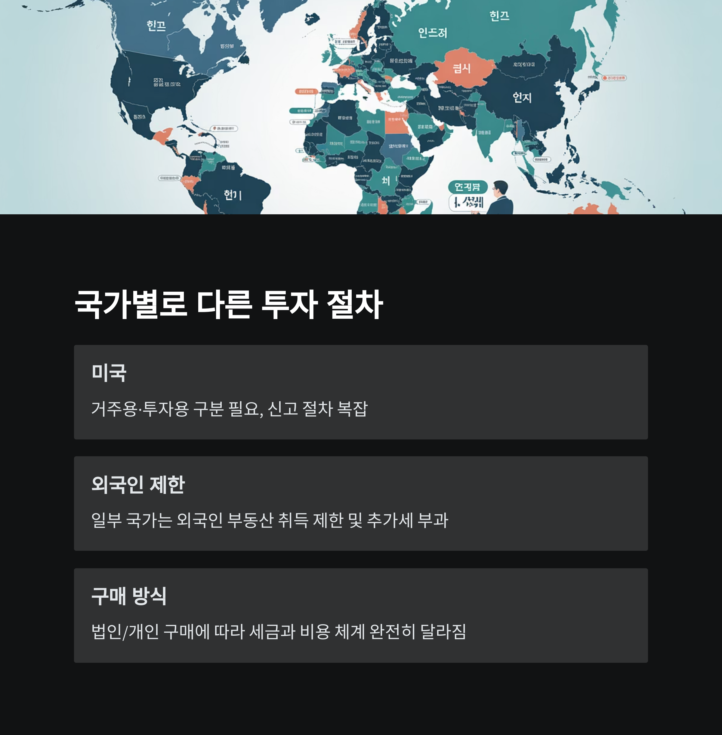 | 중개인 없이 직접 계약하는 나라도 많음 | 외국인 대상 취득세 및 양도소득세 별도 존재 | 부실한 현지 업체와 계약 시 큰 리스크 존재 |