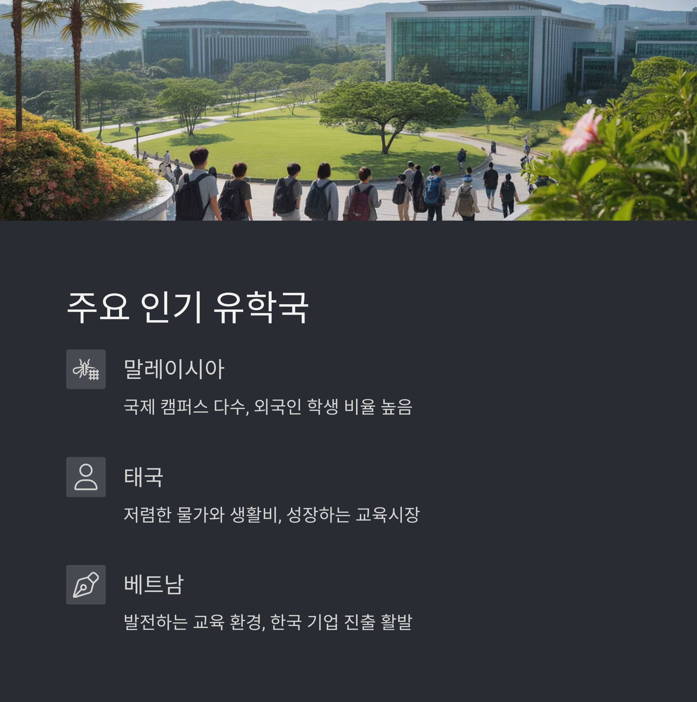 동남아 유학을 고려하는 한국 학생들의 수는 해마다 증가하고 있습니다. 이는 단순히 비용적인 이점 때문만이 아니라, 글로벌한 인재로 성장하기 위한 환경으로 동남아시아 대학들이 매우 효율적인 대안을 제시하고 있기 때문입니다. 말레이시아, 태국, 베트남 등에서는 이미 한국어 안내나 입학상담 지원 체계를 갖춘 대학들이 많아졌고, 국제 학생 유치를 위한 학사 과정 개선도 활발하게 이루어지고 있습니다.