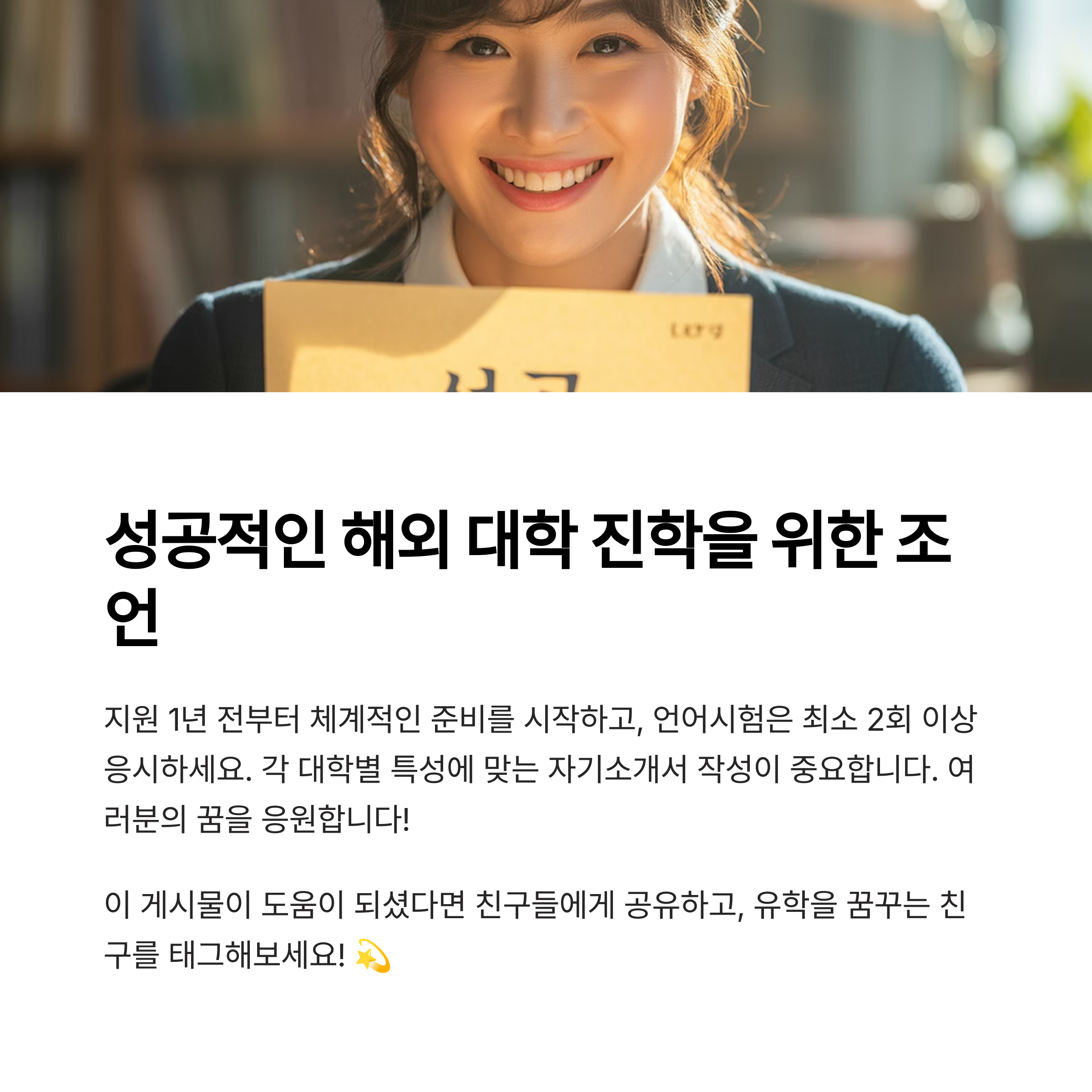 해외 대학 진학은 막연히 생각하는 것보다 훨씬 구체적이고 체계적인 준비가 필요합니다. 입학 조건을 명확히 이해하고, 자신의 목표에 맞는 전략을 세우는 것이 성공적인 유학 생활의 첫걸음입니다. 이번 글을 통해 GPA, 영어 점수, 자기소개서 등 주요 조건들을 정리해 보았는데요, 각자의 상황에 맞게 우선순위를 정하고 철저히 준비하신다면 좋은 결과를 얻으실 수 있습니다. 특히 지원 대학의 공식 홈페이지나 입학처 정보를 참고하여 최신 입학 조건을 확인하는 습관도 매우 중요합니다. 유학은 단순한 학문이 아니라 인생의 커다란 전환점이 될 수 있습니다. 여러분의 꿈을 응원하며, 앞으로도 실질적인 정보로 도움을 드리겠습니다.