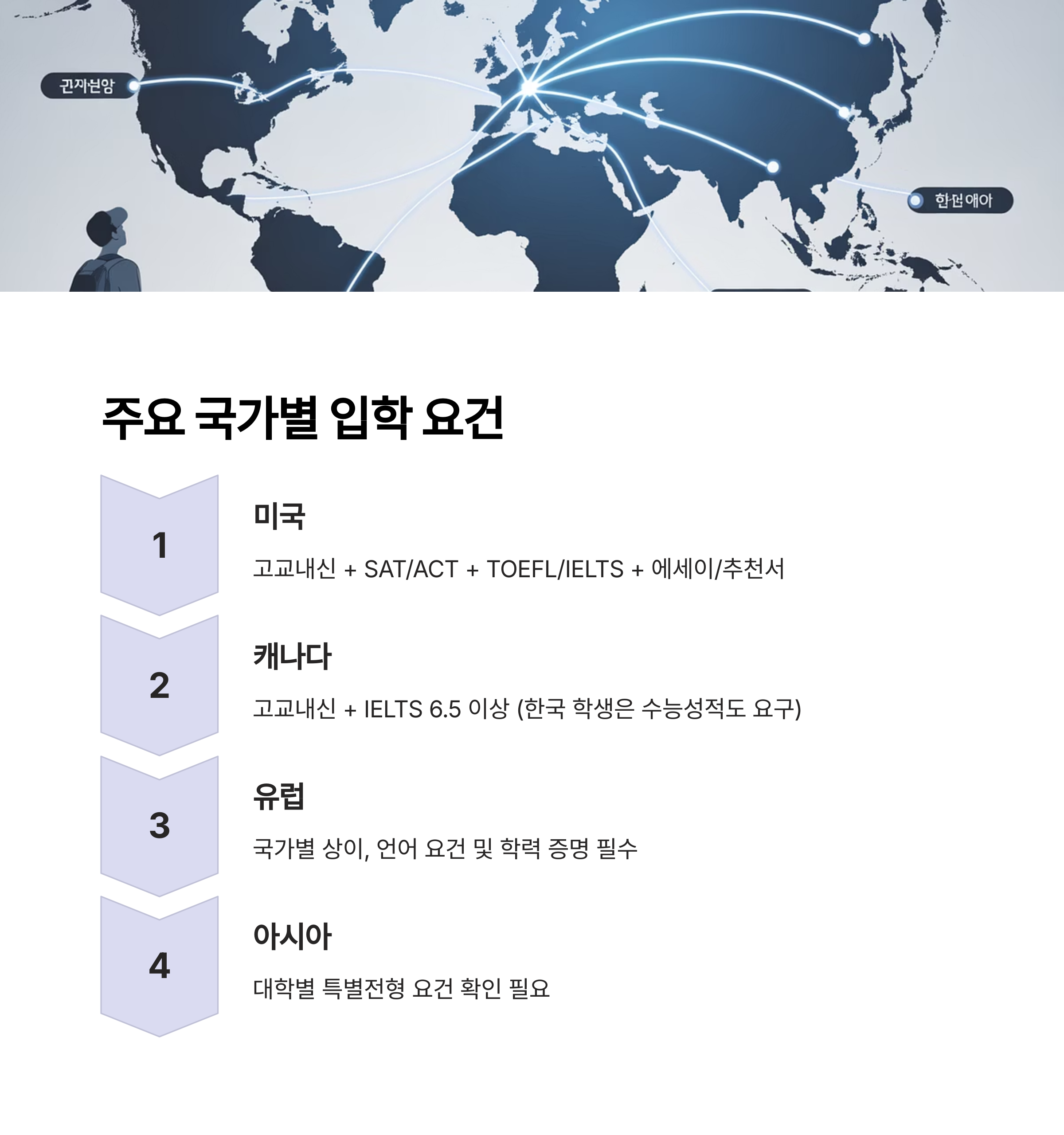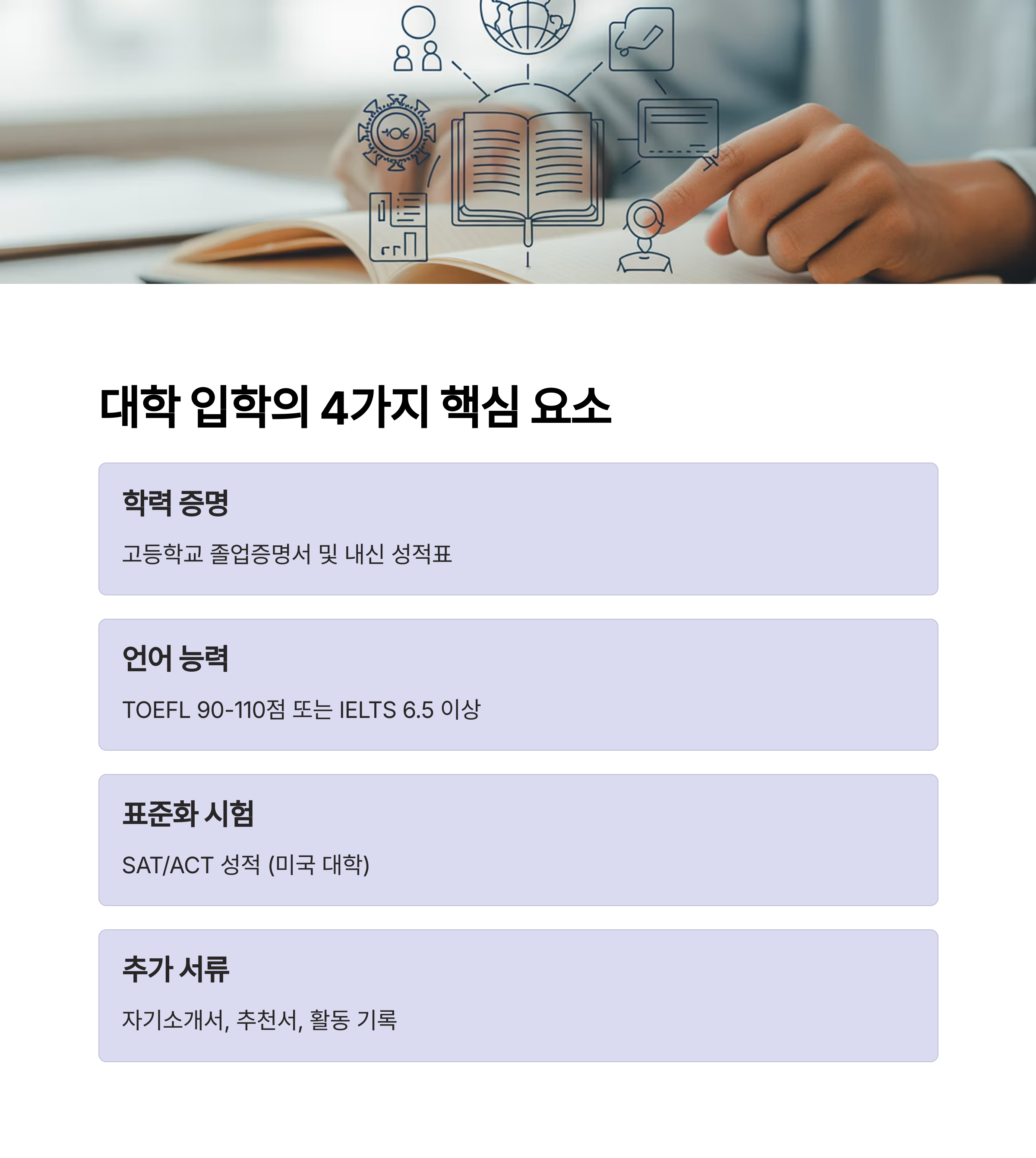 내신 평균 3.0 이상이 기본 기준입니다. | TOEFL/IELTS 점수 필수, 학교별 상이 | 지원 동기, 비전, 전공 열정을 담아야 함 |