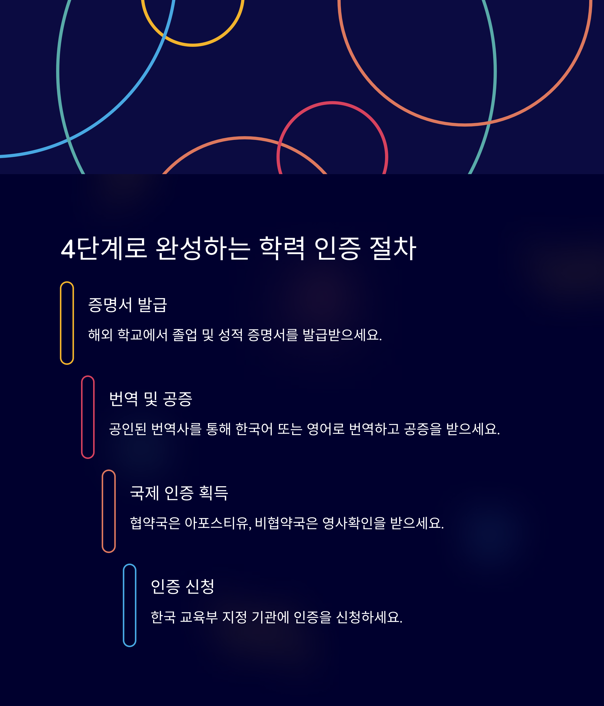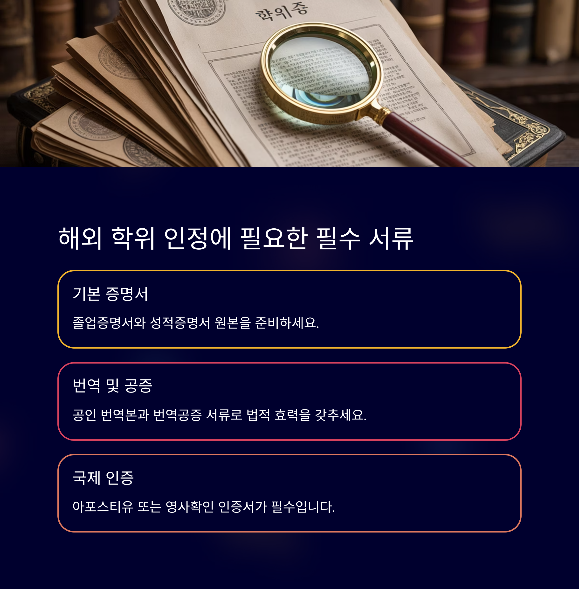 절차는 생각보다 간단하지만, 단계별로 준비해야 할 서류들이 다릅니다. 일반적으로 졸업증명서, 성적증명서, 현지 공증 및 아포스티유 또는 영사 확인서류를 요구하는데, 국가 및 학교에 따라 조건이 달라질 수 있습니다. 또한 해당 기관에 따라 원본 제출 여부나 번역 공증 요건이 다르므로, 사전에 확인하고 진행해야 불필요한 시행착오를 줄일 수 있습니다.