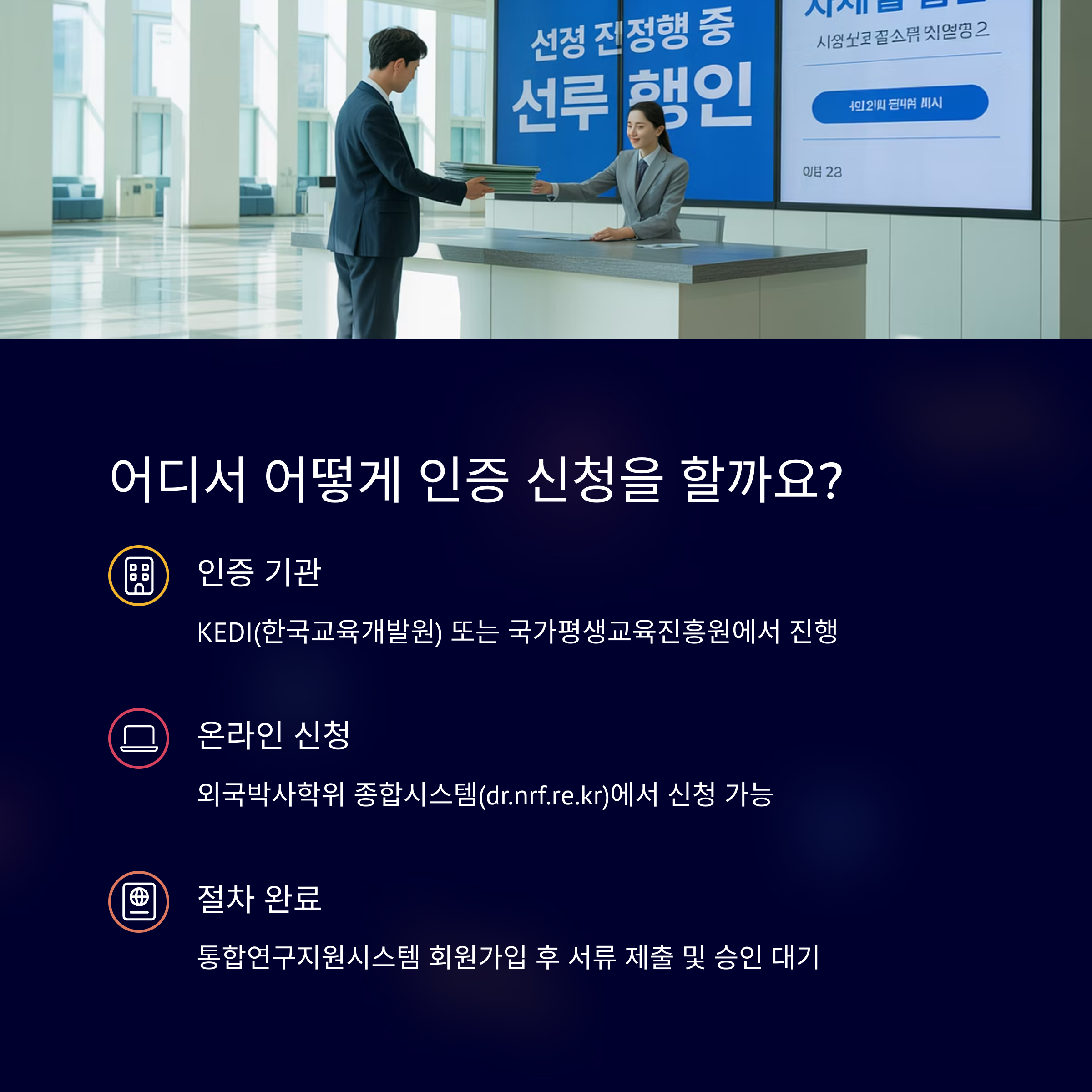 | 국가평생교육진흥원, 한국교육개발원 등 | 졸업증명서, 성적표, 아포스티유 혹은 영사확인 | 평균 2~4주, 서류 누락 시 더 지연 가능 |