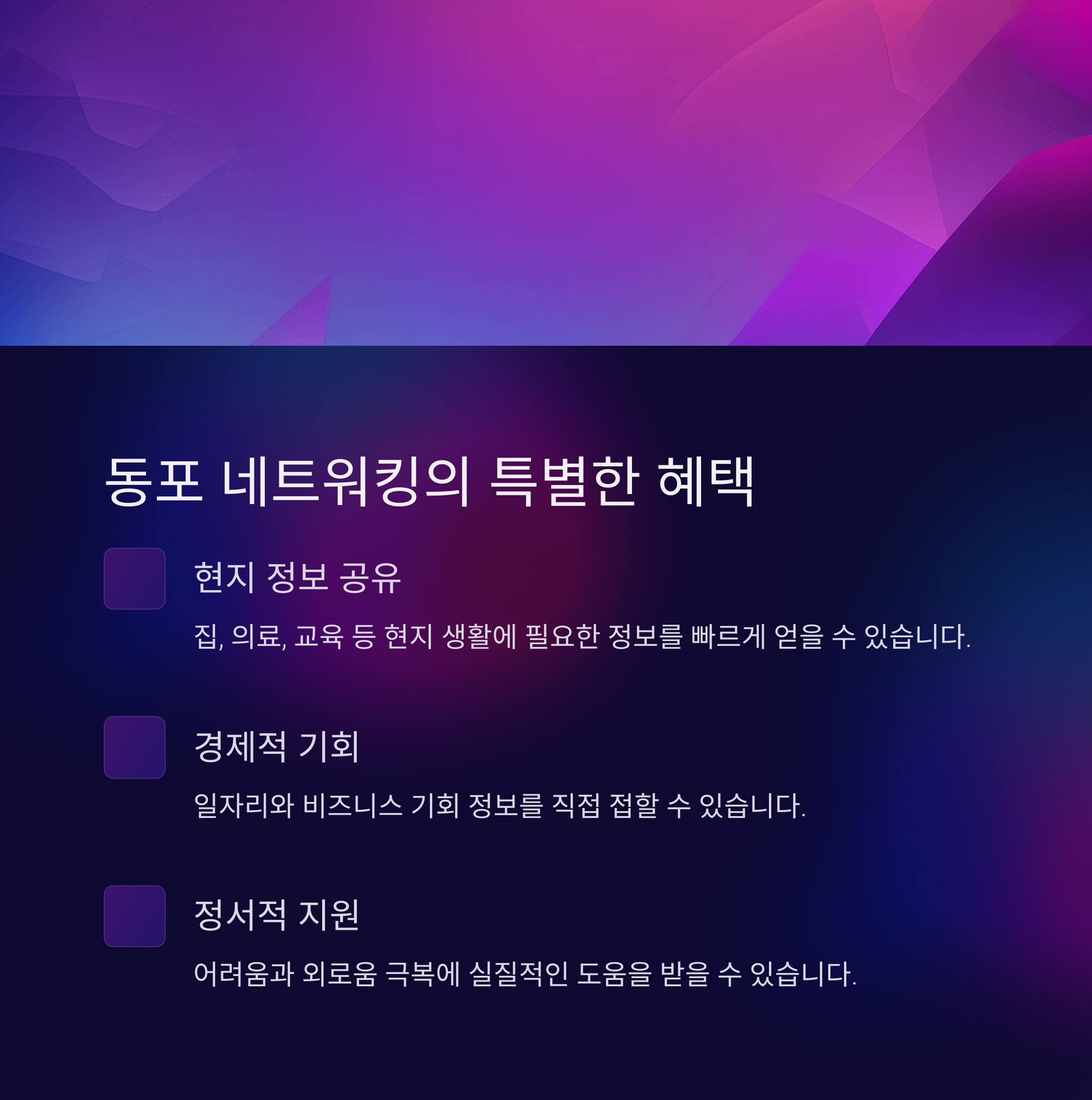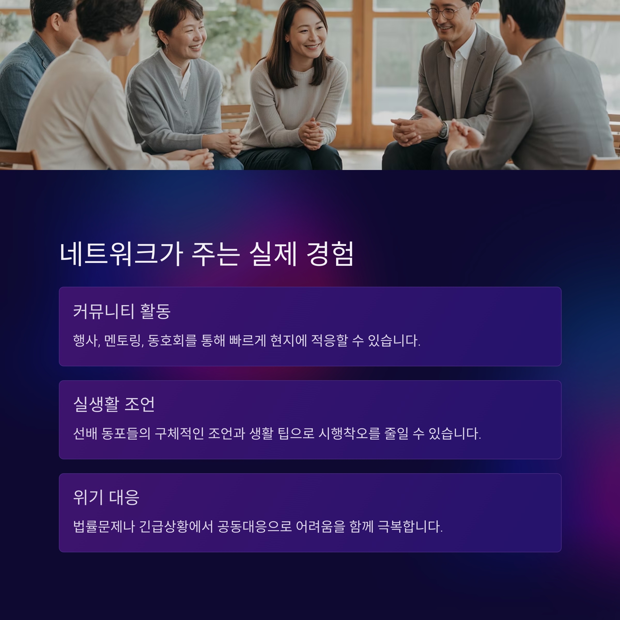 | 동포 네트워킹 | 같은 문화를 공유하는 현지인과의 연결망입니다. |
