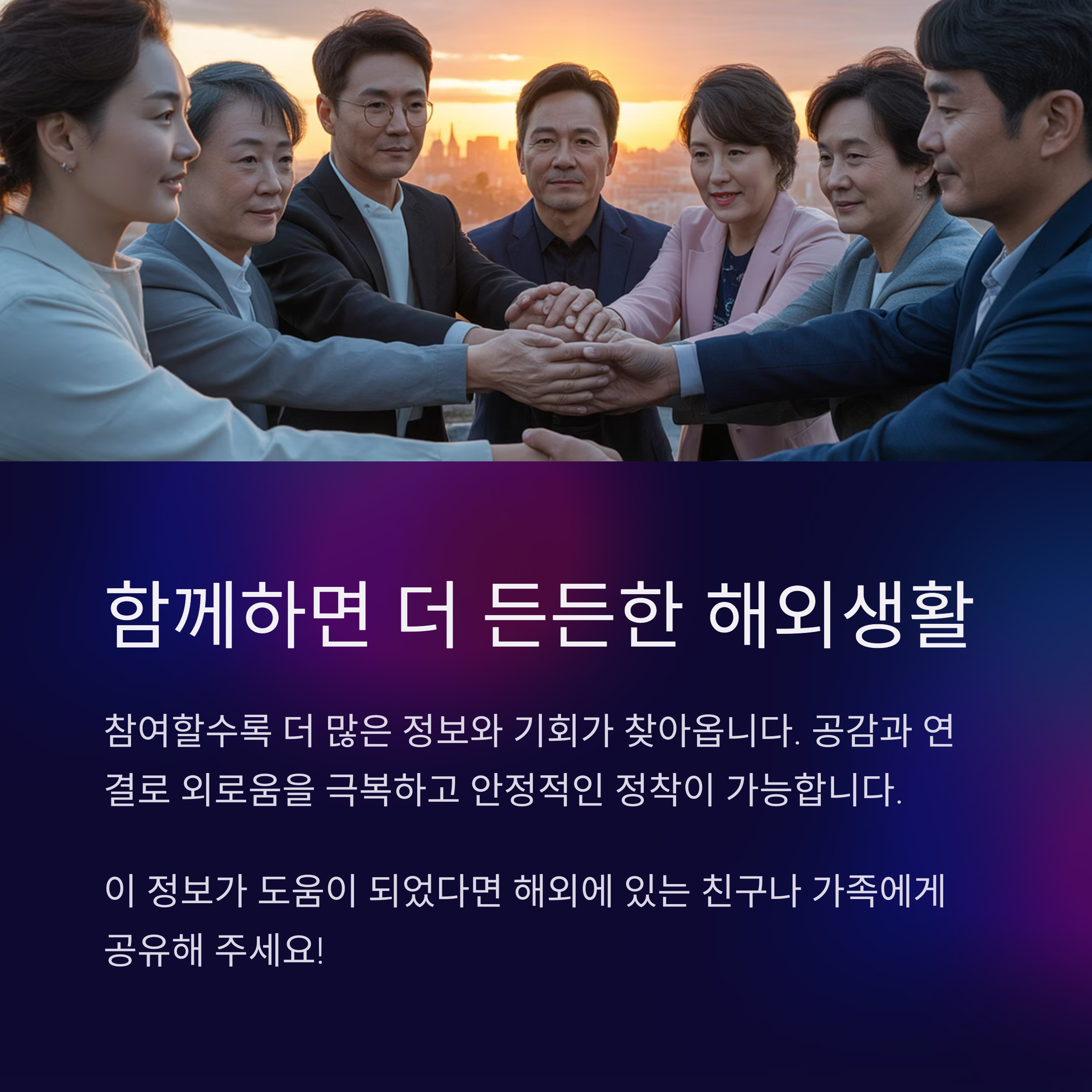 해외에서의 생활은 생각보다 많은 어려움을 동반합니다. 그러나 그 안에서 희망과 기회를 찾는 방법은 분명 존재합니다. 동포 네트워킹은 단순한 모임이 아닌, 생존과 성장의 발판입니다. 정보를 얻고 정서적 안정까지 갖출 수 있는 강력한 도구이며, 우리가 낯선 환경에서 안정적으로 뿌리내릴 수 있도록 돕습니다. 더 이상 혼자가 아님을 느끼고, 공동체 속에서 희망을 찾는 여정을 시작해 보세요. 진심 어린 연결은 언제나 우리의 삶을 더 나은 방향으로 이끌어 줄 것입니다.