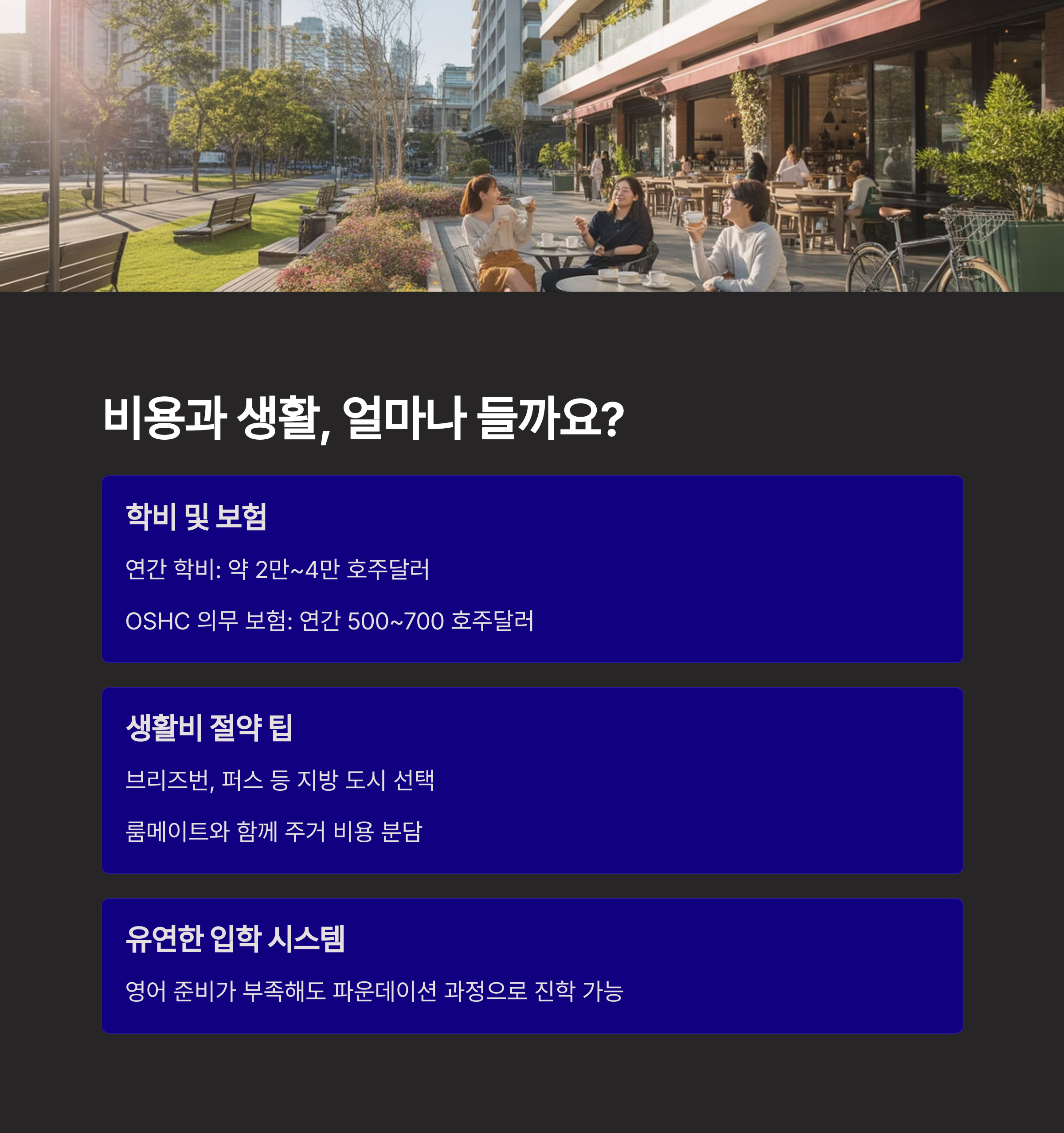 | 호주 유학 단점 | 생활비 부담, 거리상 고립감, 비자 발급 절차 복잡 |