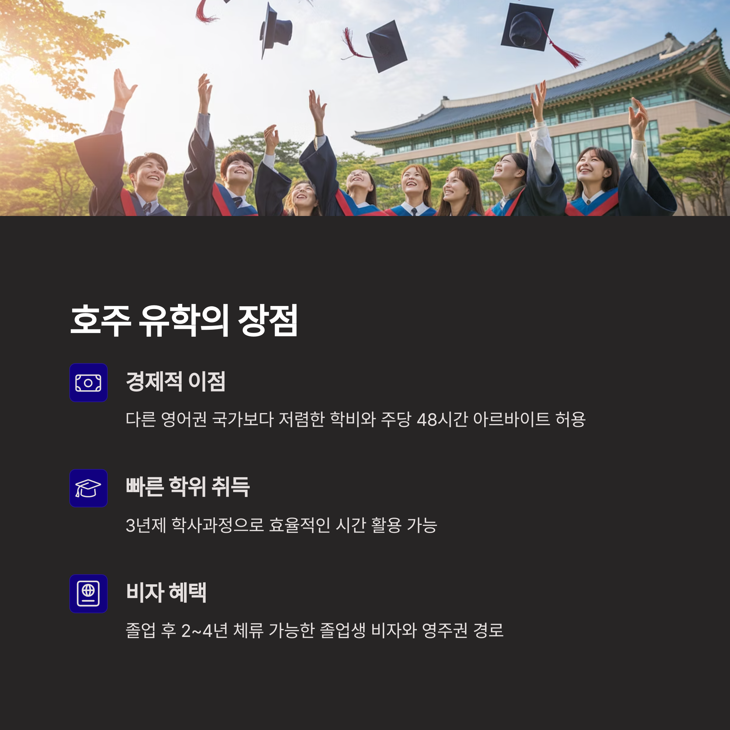 | 호주 유학 장점 | 안전한 환경, 글로벌 교육 시스템, 다양한 장학 혜택 |