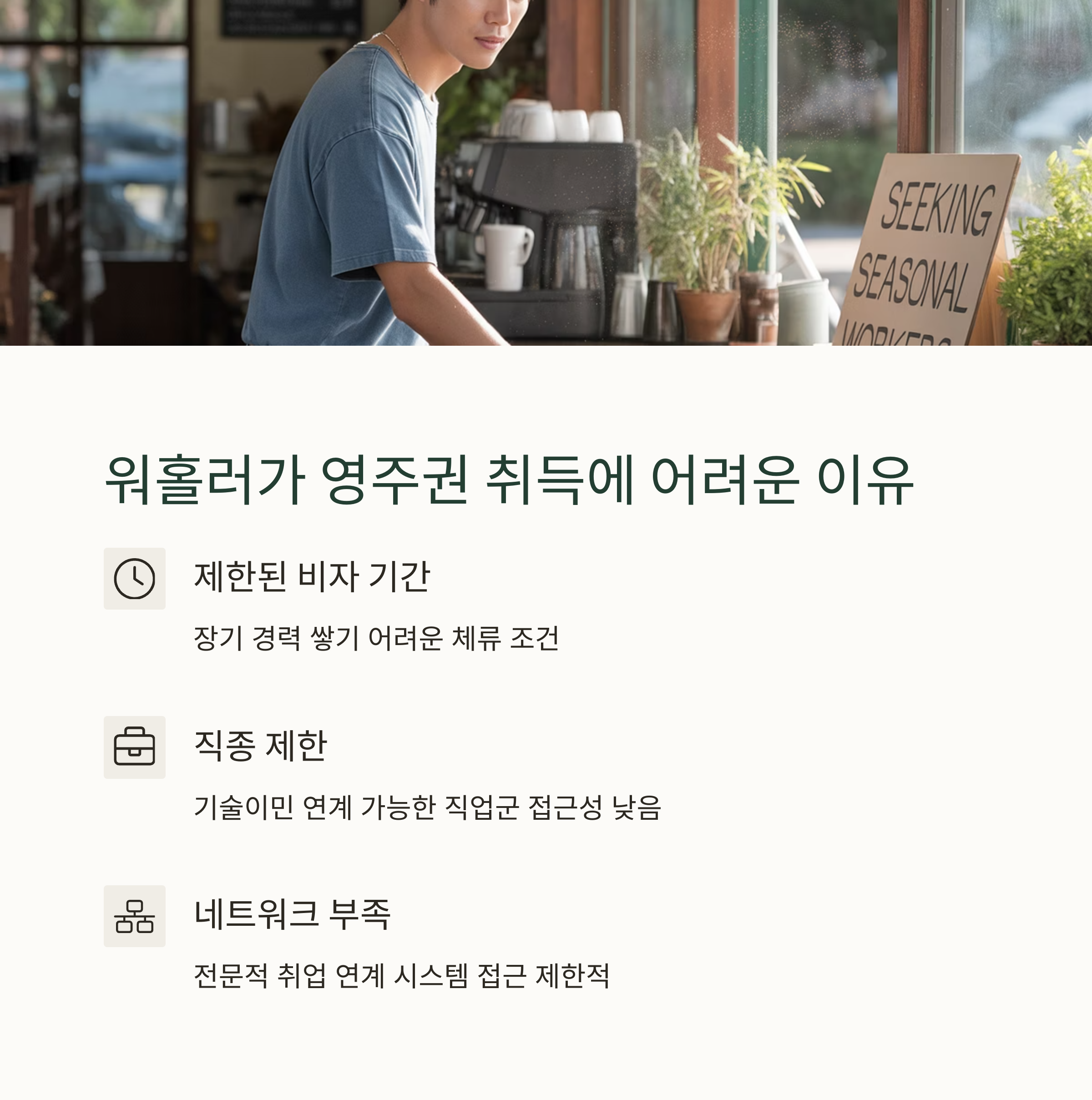 | 워홀러 영주권 확률 | 제한된 체류기간과 직종 제한으로 불리함 |