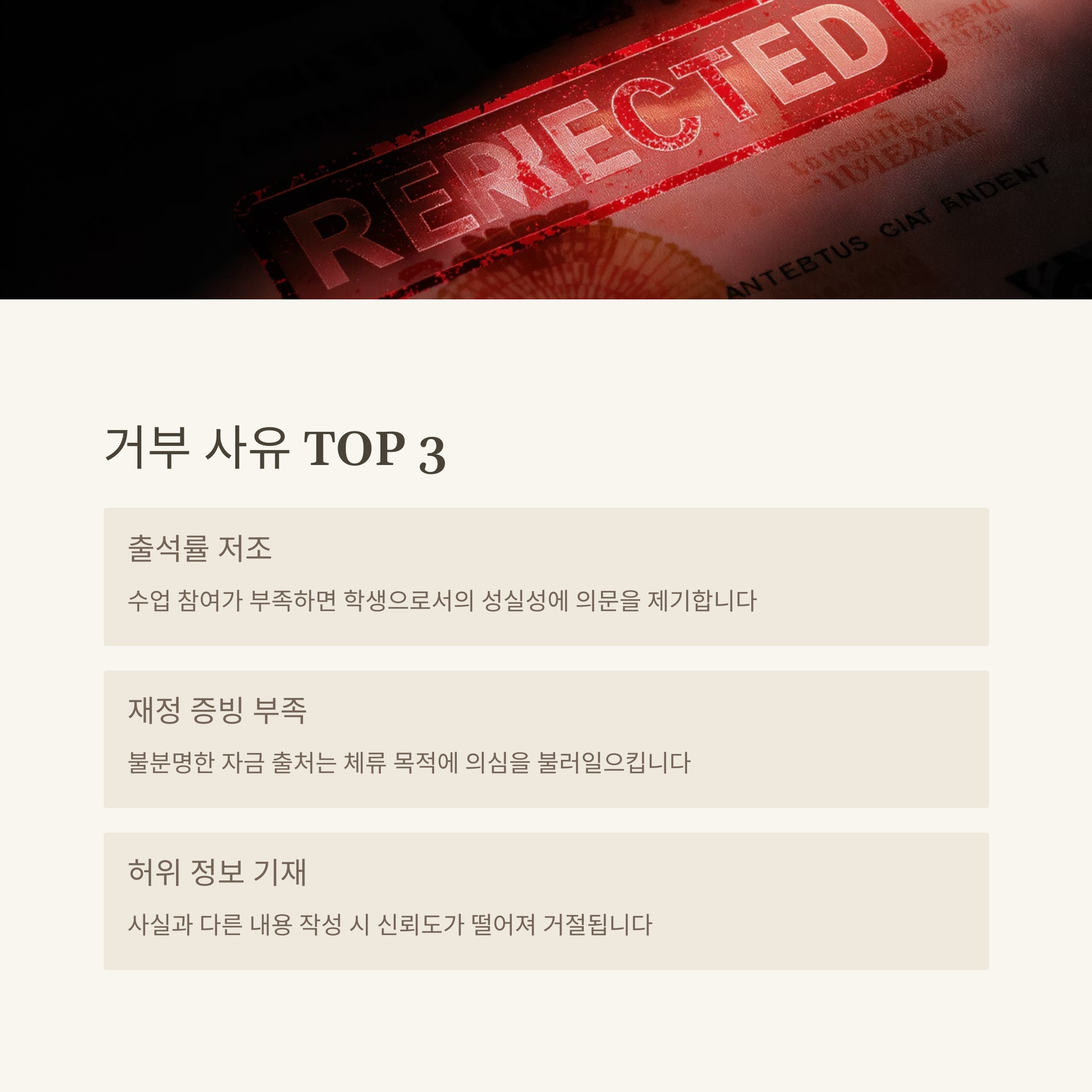 | 학교 출석률이 80% 미만이면 거절될 수 있습니다. | 잔고 증명만으로는 부족하며, 출처가 중요합니다. | 실수로 잘못 기재해도 비자 거부 사유가 됩니다. |