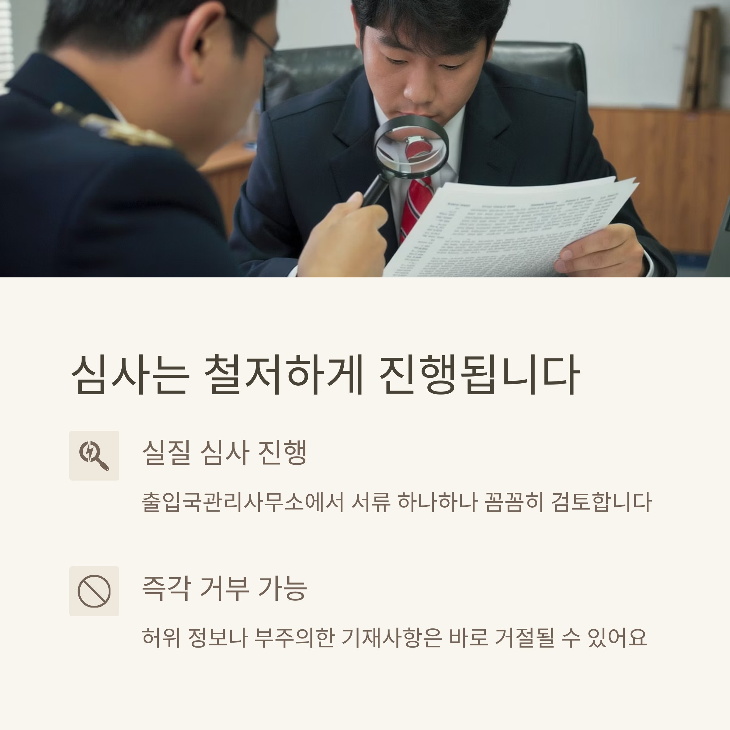 학교 출석률이 80% 미만이면 거절될 수 있습니다. | 잔고 증명만으로는 부족하며, 출처가 중요합니다. | 실수로 잘못 기재해도 비자 거부 사유가 됩니다. |