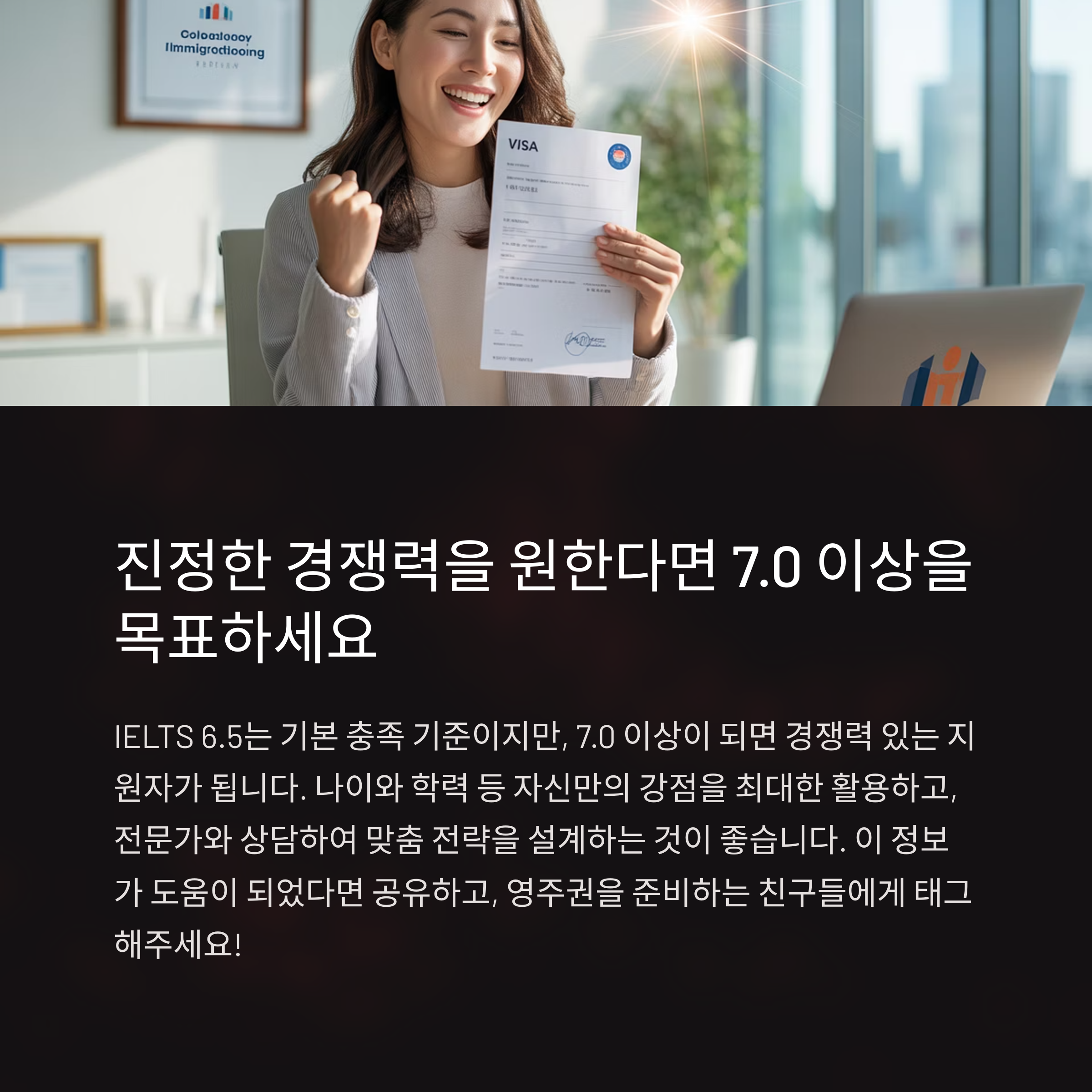 | 7.0 이상일 경우 추가 가산점 가능 | Express Entry 등은 CLB 기준 병행 | 이민 컨설턴트 상담도 큰 도움 |